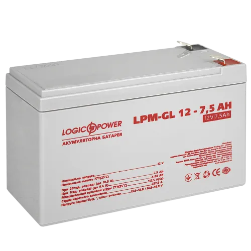 LPM-GL 12 - 7.5 AH – гелевый аккумулятор, конструкция которого подразумевает применение современной технологии GEL (используются намазные пластины, с нанесенным на них электролитом в гелеобразном состоянии).