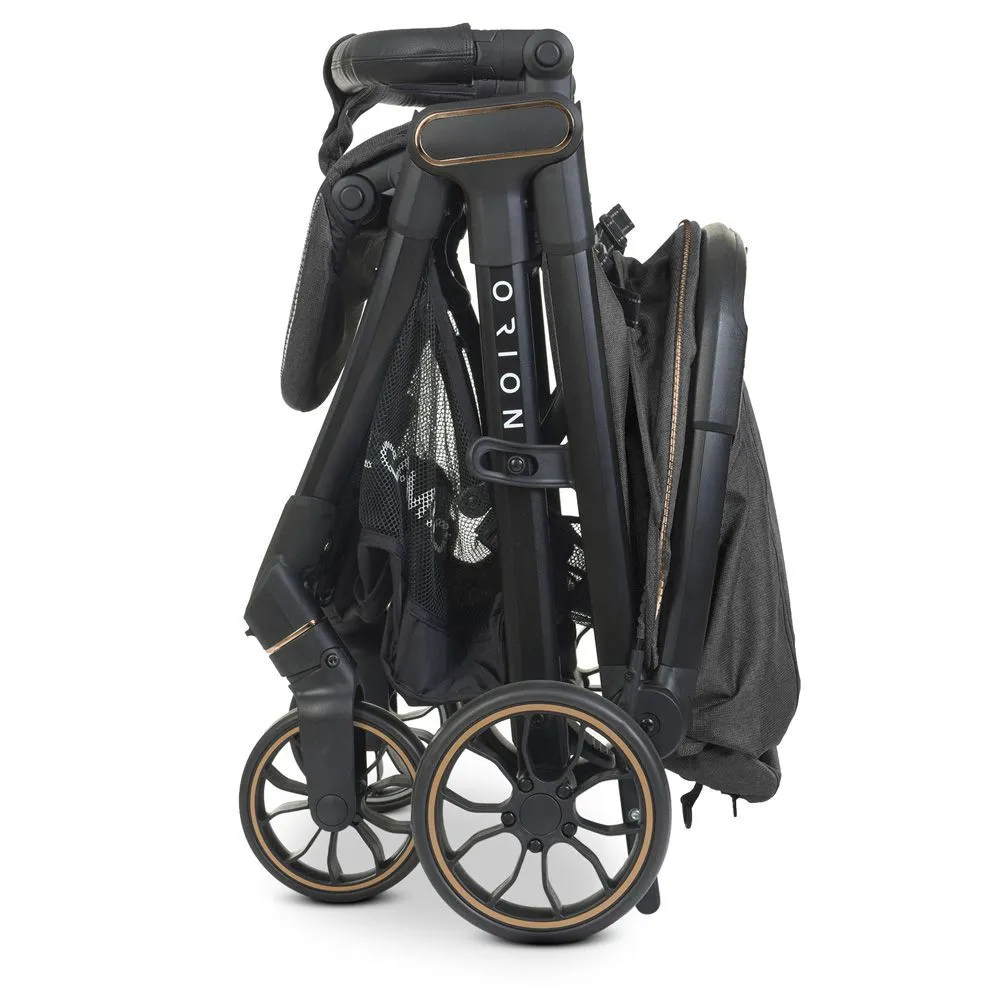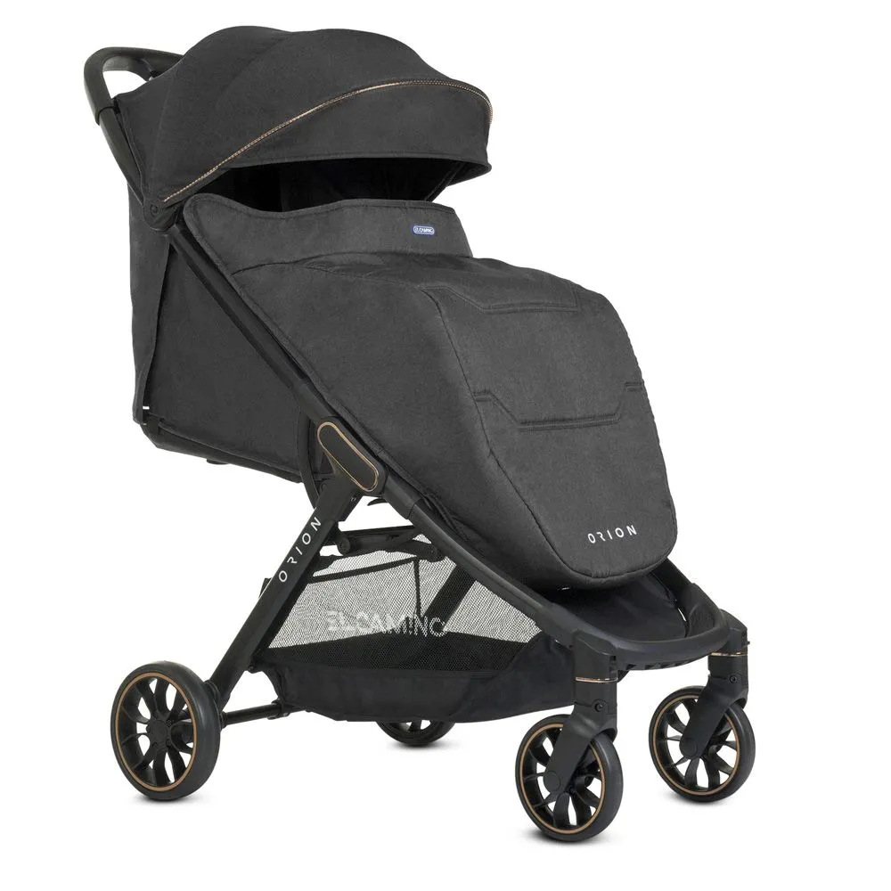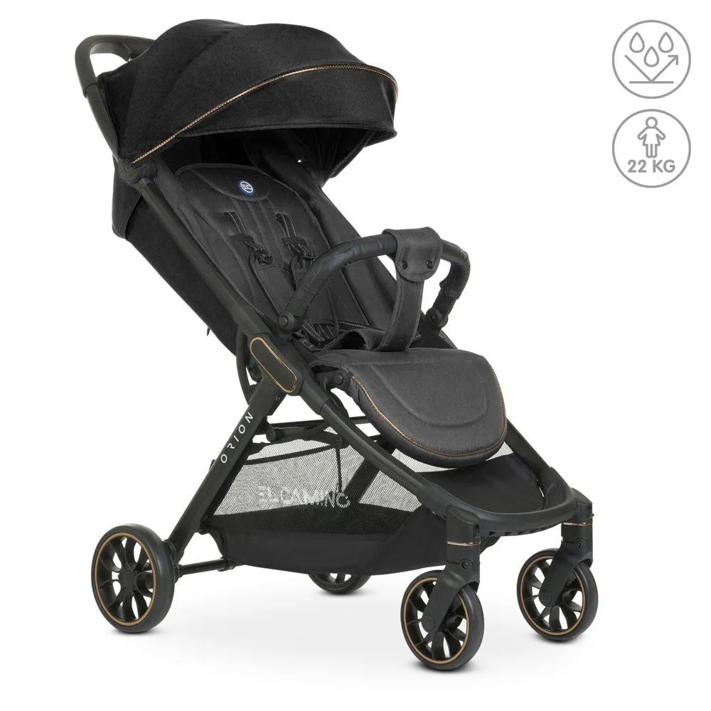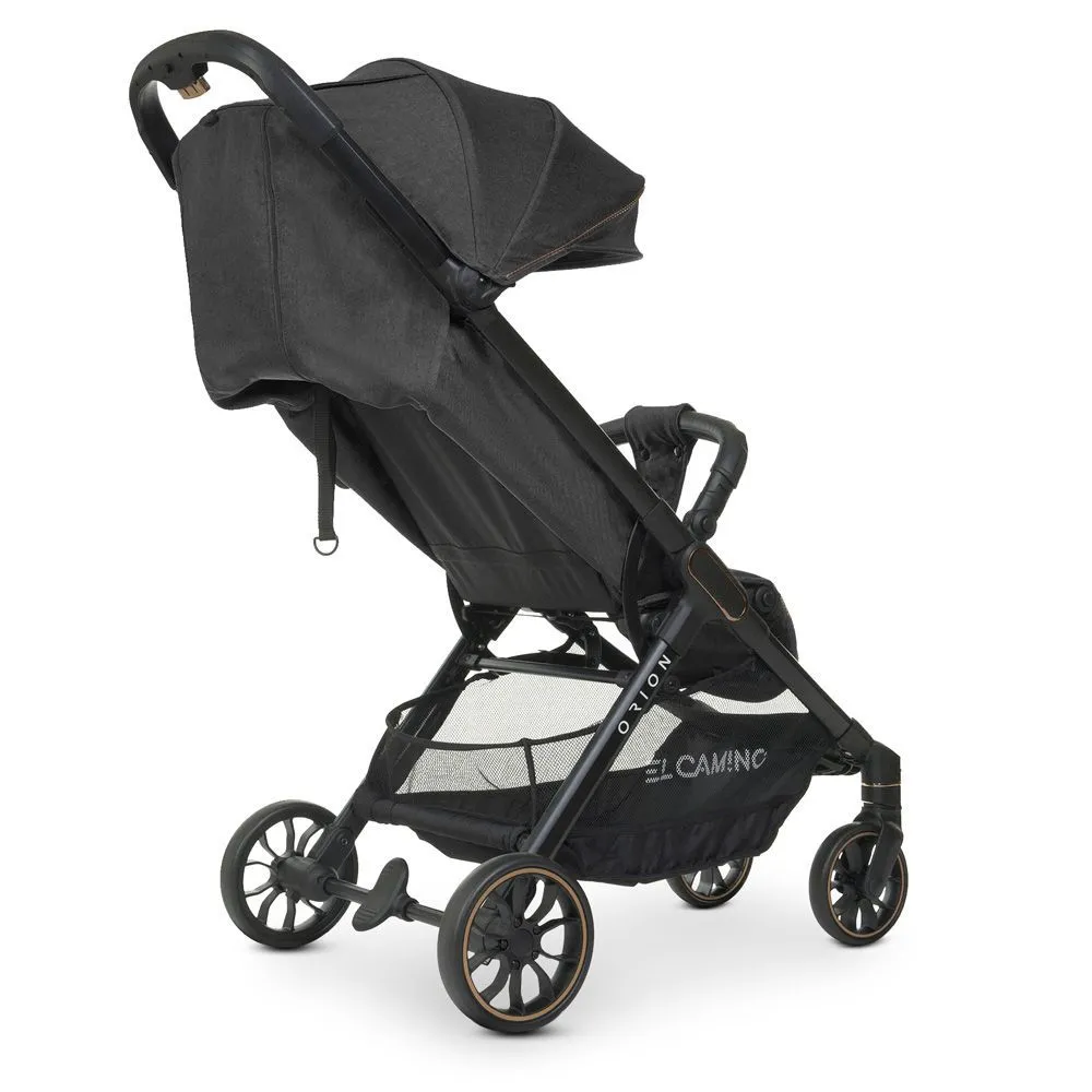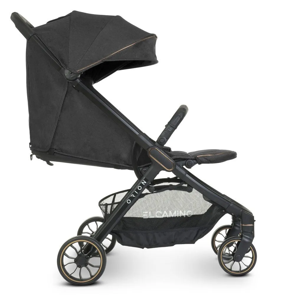 El Camino ME 1084 ORION Dark Gray - новинка сезона с необычным дизайном, дополненным серебристыми или бронзовыми деталями на капюшоне, шасси и ободках колес. Широкое спальное место, глубокий капюшон со смотровым окошком и секцией с вентиляцией, регулируемая до горизонтального положения спинка обеспечивают ребенку необходимый комфорт во время прогулок.