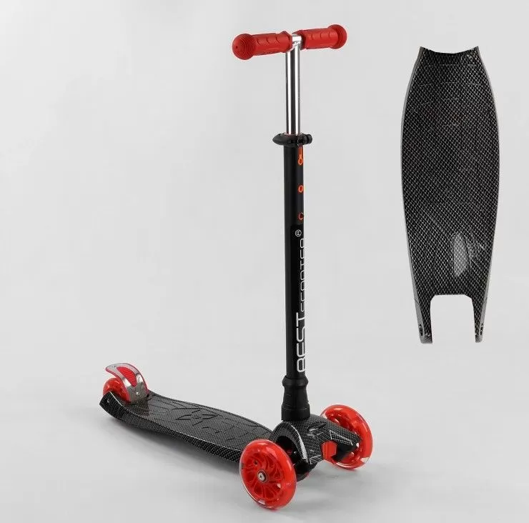 Трехколесный самокат со светящимися колесами от “Best Scooter” предназначен для маленьких любителей активного отдыха. Яркий дизайн данной модели с первого взгляда привлечет внимание малыша и станет любимым транспортным средством! За счет трехколесной конструкции и сдвоенному заднему колесу самокат достаточно устойчив и предотвращает падения во время катания.Пластмассовая дека самоката выполнена из прочного материала и крепится на раму. Т-образный руль имеет прочное металлическое основание. Высота руля фиксируется в 3х положениях. Фигурные грипсы выполнены из резины с рельефными узорами, которые предотвращают соскальзывание ладони с руля во время катания. Наклонная система поворота руля обеспечивает максимально легкое и безопасное управления самокатом.